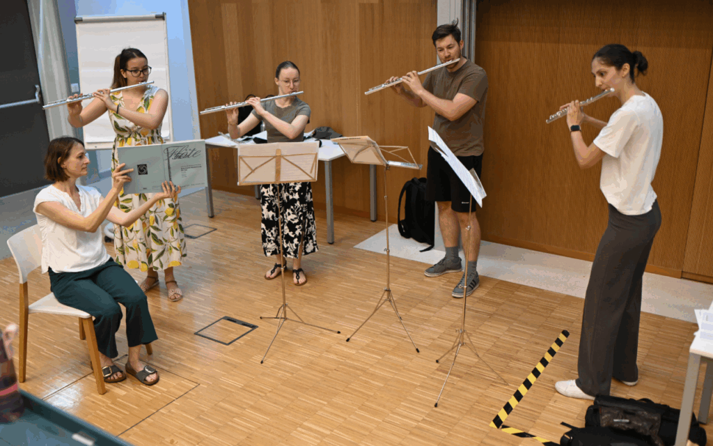 Am 2. Juli stellten die Studierenden Ema Kermc, Sarah Strobl, Jakob Kern und Sabrina Schasche unter der Leitung von Sieglinde Größinger-Potzmann die Querflöte vor. Gemeinsam mit den Kindern erkundeten sie die Besonderheiten dieses Instruments und seine klanglichen Möglichkeiten. Am darauffolgenden Tag stand die Geige im Fokus. Die Studentinnen Theresa Aichner, Eunjoo Seol, Ulrike Krülle, Aldina Ban, Gaia Primic, Zoja Pogačnik und Aja Hrovat (betreut von Lara Celestina-Finlayson) spielten Stücke vor, welche die Kinder erraten sollten, und ließen sie die Geige auch selbst ausprobieren.
