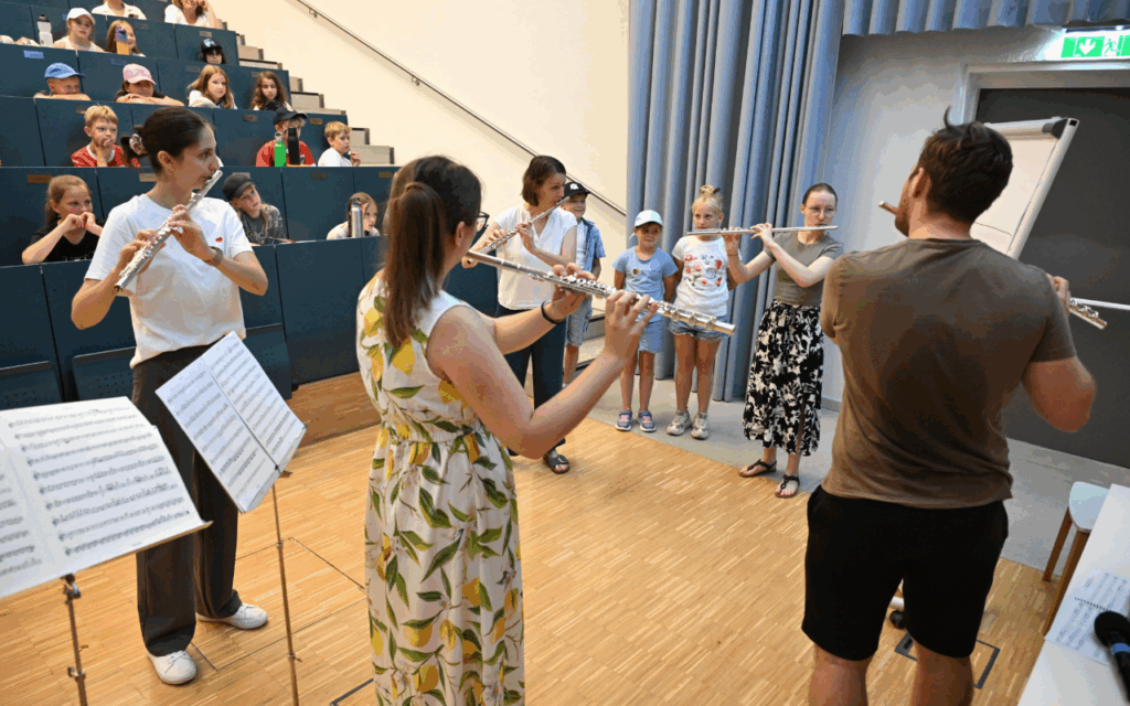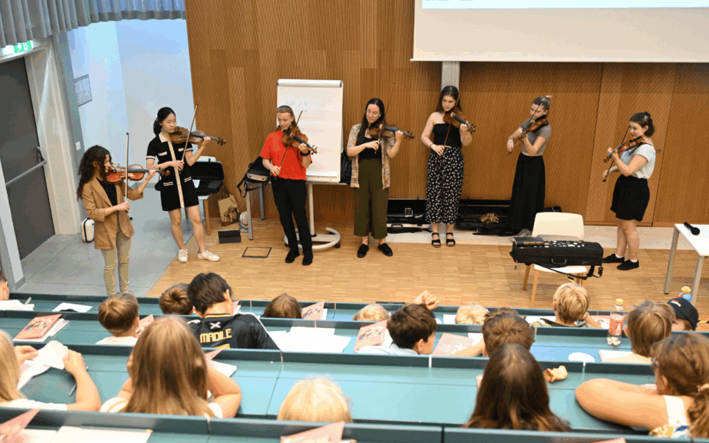 Am 2. und 3. Juli 2025 fand an der Universität Klagenfurt die alljährliche UNI FÜR KINDER statt. Dieses besondere Programm ermöglicht Schüler*innen der 3. und 4. Schulstufe, die Universität und die universitäre Forschung an einem Vormittag hautnah kennenzulernen. Insgesamt konnten im Februar und Juli jeweils 50 Kinder an den Veranstaltungen teilnehmen. Neben verschiedenen Workshops und einer Universitätsbibliotheksführung standen Anfang Juli auch Instrumentenvorstellungen durch Studierende der GMPU auf dem Programm.