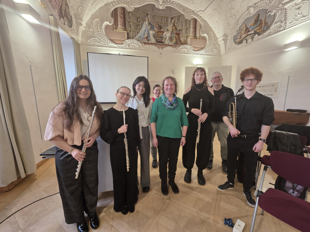 Sechs Studierende des Seminars „Interpretation im Dialog von Praxis und Wissenschaft“ (Leitung: Klaus Kuchling und Ramona Hocker) haben zum Semesterende die Ergebnisse ihrer interpretatorischen Arbeit in einem moderierten Werkstattkonzert präsentiert. Das vielfältige Programm reichte vom barocken Flötenstück über Mozart und Haydn am Klavier sowie romantisch-virtuose Flötenspiele bis hin zur Musik des 20. Jahrhunderts, die Szenen aus „Winnetou“ evozierte.