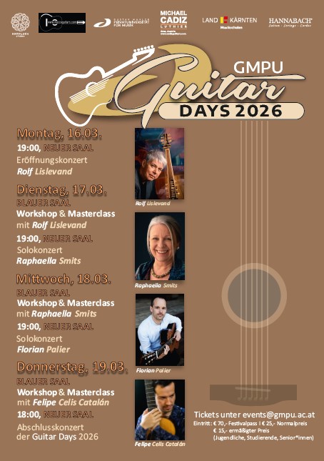 Vier Tage lang öffnen die GMPU Guitar Days Räume für Klang, Nähe und Entdeckung. Internationale Künstler*innen, herausragende Nachwuchsmusiker*innen und Lehrende begegnen einander auf Augenhöhe – im Konzert, im Diskurs, im Experiment. Das Programm spannt den Bogen von klassischer Gitarrenkunst bis hin zu improvisieren, genreübergreifenden Formaten, in denen die Gitarre die Hauptrolle spielt. Tickets unter events@gmpu.ac.at […]