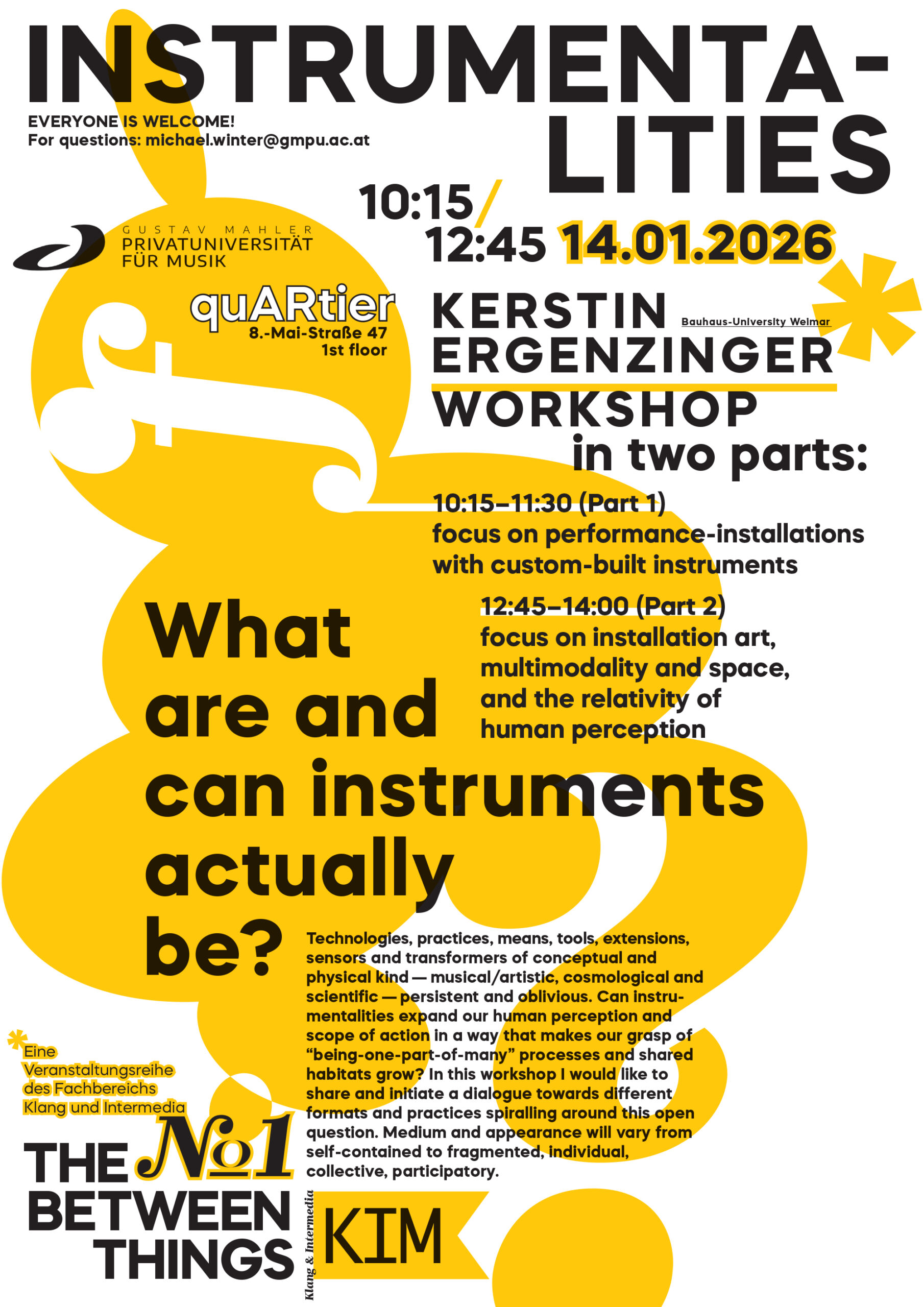 Workshop with Kerstin Ergenzinger (Bauhaus-University Weimar) 10:15 - 11:30 (Part 1) focus on performance-installations with custom-built instruments 12:45 - 14:00 (Part 2) focus on installation art, multimodality and space, and the relativity of human perception Eine Veranstaltung des Fachbereichs Klang und Intermedia Eintritt frei | Alle sind willkommen Information unter michael.winter@gmpu.ac.at