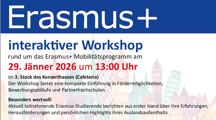 ...rund um das Erasmus+ Mobilitätsprogramm! Der Workshop bietet eine kompakte Einführung in Fördermöglichkeiten, Bewerbungsabläufe und Partnerhochschulen. Besonders wertvoll: Aktuell teilnehmende Erasmus-Studierende berichten aus erster Hand über ihre Erfahrungen, Herausforderungen und persönliche Highlights ihres Auslandaufenthalts. Treffpunkt: 3. Stock (GMPU) in der Cafeteria