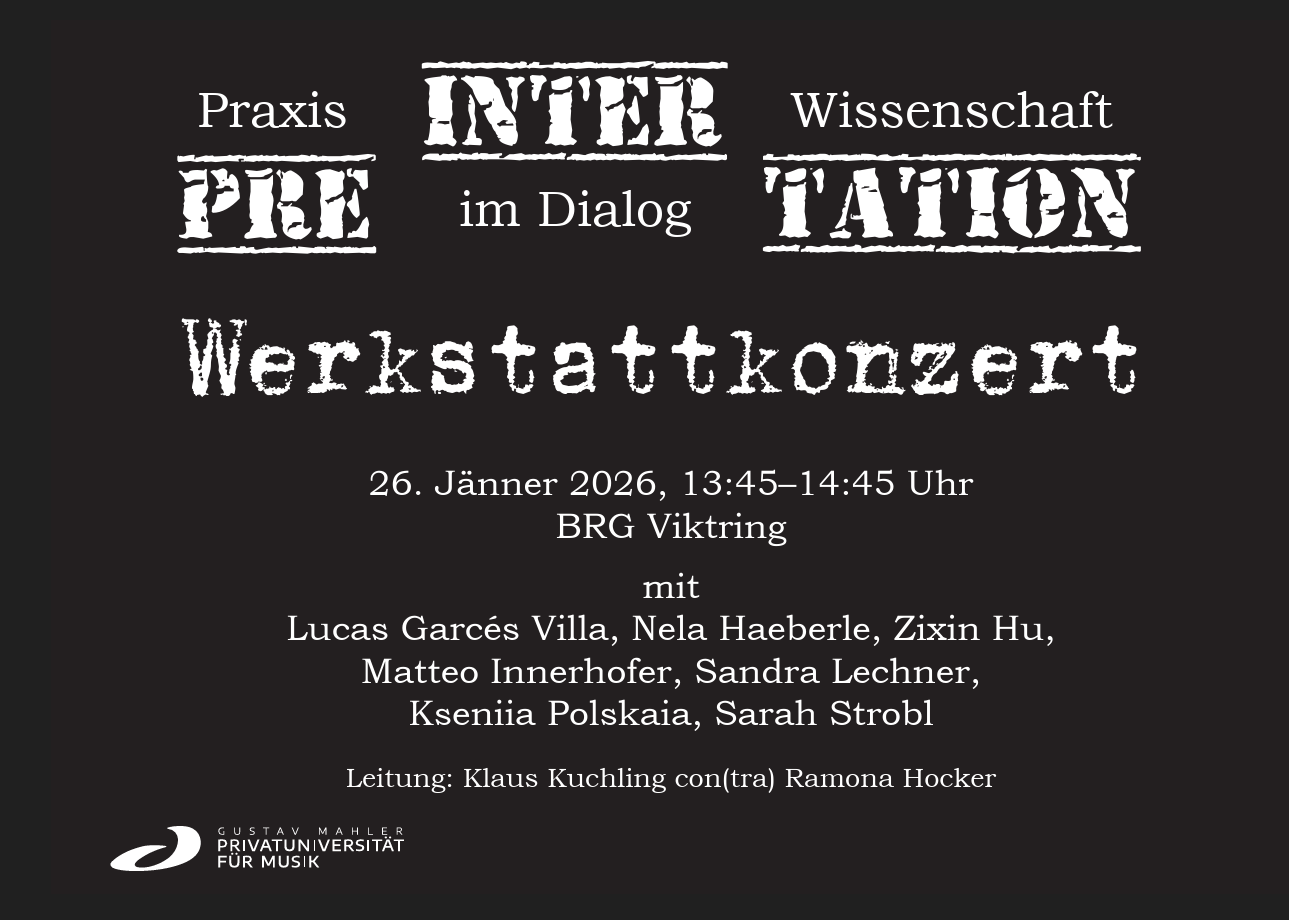 Werkstattkonzert Seminar „Interpretation im Dialog von Praxis und Wissenschaft“ Leitung: Klaus Kuchling und Ramona Hocker 26.1.2026, 13:45–14:45, BRG Viktring